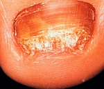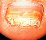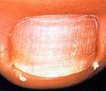 これは白癬菌というカビによる感染症です。ほっておくと爪が変色したり変形したりするばかりでなく、常に白癬菌をばらまいているので、家族に水虫がうつる可能性もあります。
